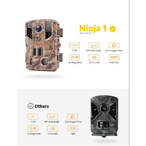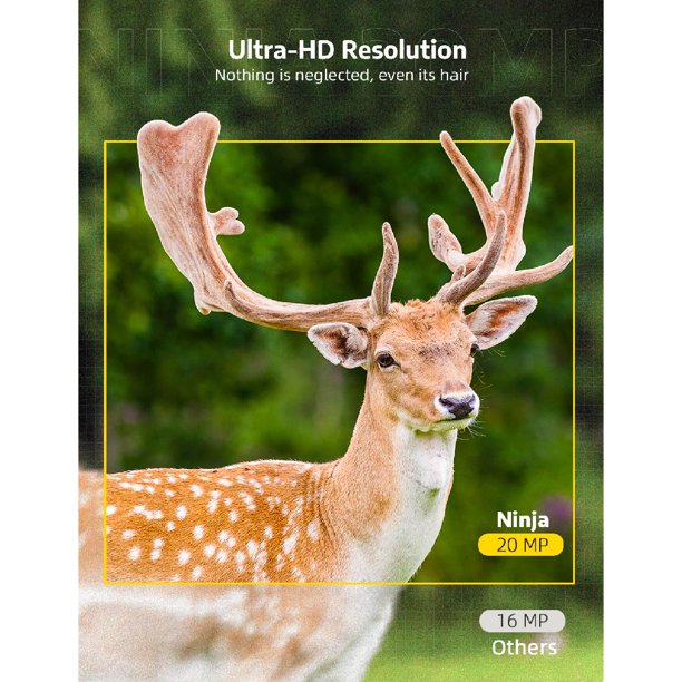 Compared with 16MP trail cameras, Ninja 1 trail camera upgrades the camera up to 20MP, presenting you with super sharp, colorful, and crystal clear day/night images.